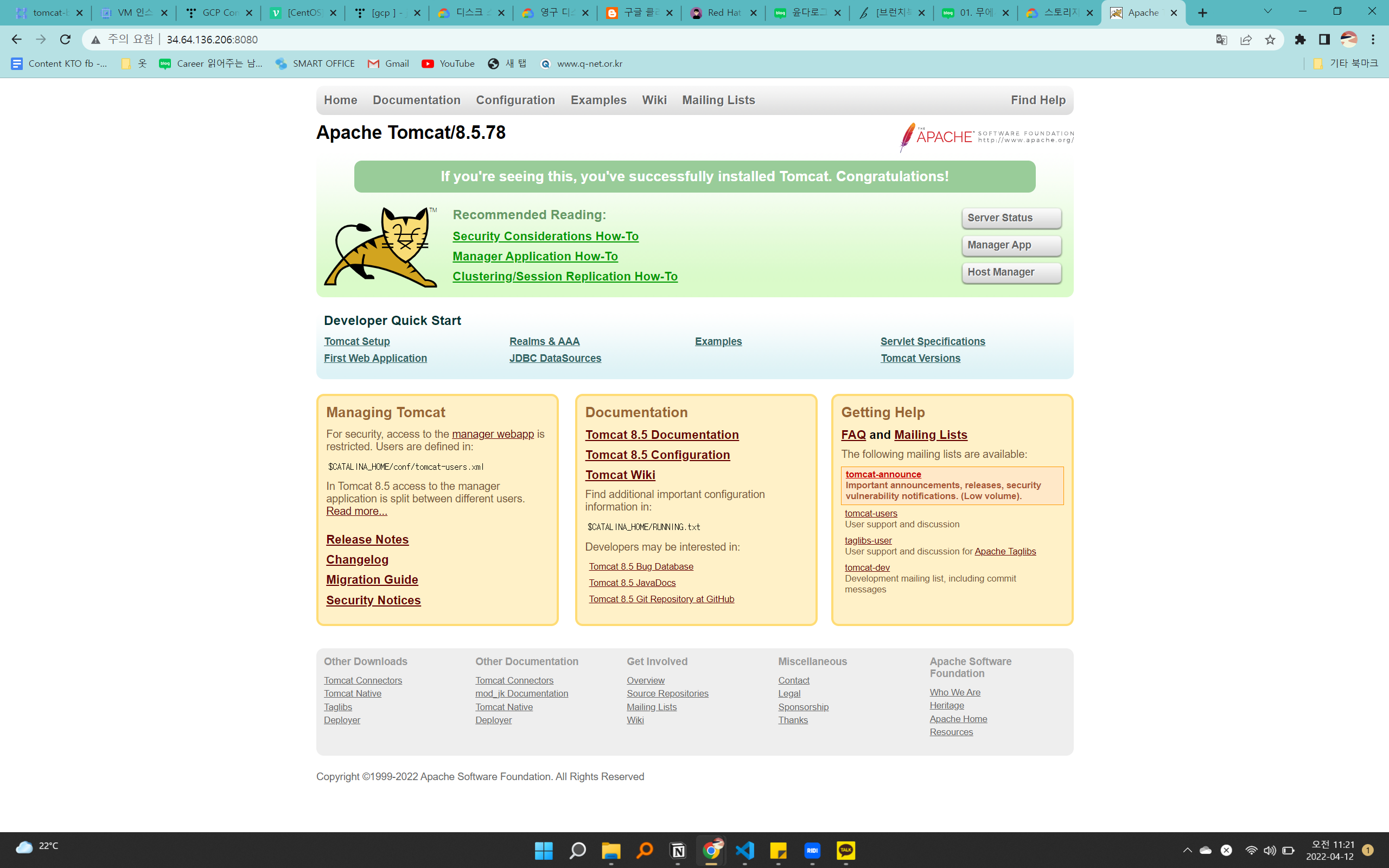 sudo mv ./tomcat9 /usr/share/ sudo sh /usr/share/tomcat9/bin/start.sh지금 tomcat다운도 다하고, 기본설정(server.xml, local로 파일옮겨서 실행) 다하고 방화벽도 8080포트 뚫고했는데 브라우저에서 톰캣이 안뜬다. 방화벽 문제인것같은데........... 뭘 더 해야하는 걸까