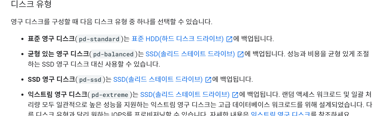 * 디스크 유형 - 나는 개인적인 공부용도로 사용하기 때문에 표준 영구디스크를 선택했는데 나는 속도와 비용에 있어서 차이가 있는 줄 알았는데 백업 장소가 달랐다.