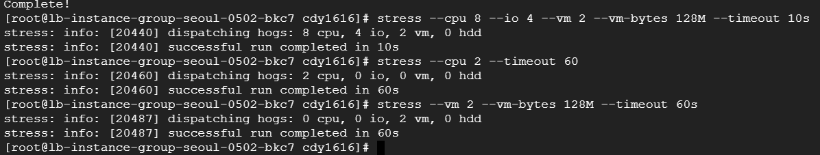 나는 생성에서 끝나는게 아니라 실제로 instance group내에서 vm이 어떻게 늘어나고 줄어드는지 확인을 해보고 싶었다. CPU사용량을 늘리기에 드는 비용이 많으니까, 부하테스트 할 때 사용하는 명령어를 입력해서 cpu사용량을 변경했다. 나는 centos기반의 vm이기 때문에 아래를 참고했다.