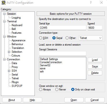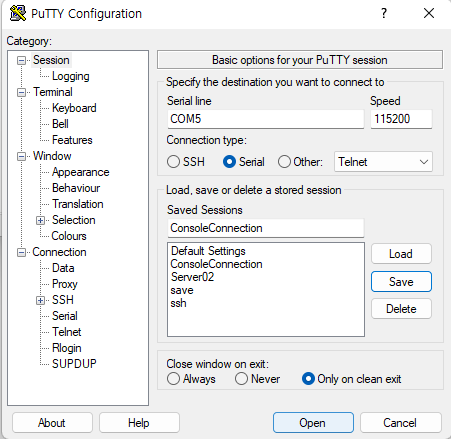 Saved Session에 ConsoleConnection 입력하고 Save한 뒤 Open