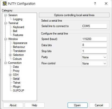 Speed : 9600으로 유지 - 아래 자료중 11520으로 설정하라는게 있었는데, 그럴경우 Putty가 안열린다.