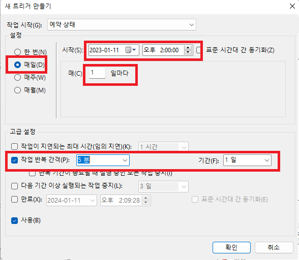 나는 테스트용으로 '하루동안', '매 5분마다' 돌게끔했다