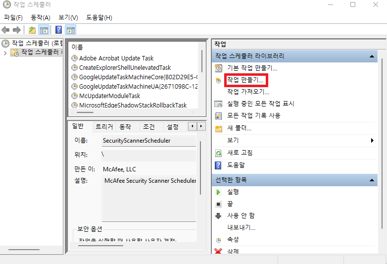 윈도우 : '작업 스케줄러' 검색 > 작업 만들기 선택