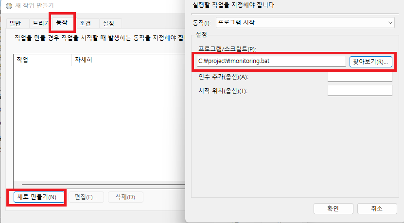 프로그램/스크립트 부분에 실행실킬 배치파일(.bat)을 올리면 된다!!