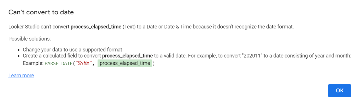 PARSE_DATE("%Y%m", process_elapsed_time) as 'elapsed_time'으로 하기에 나는 지금 초(second)를 다루고 있으니 ..