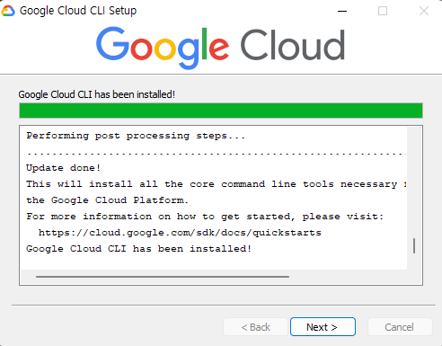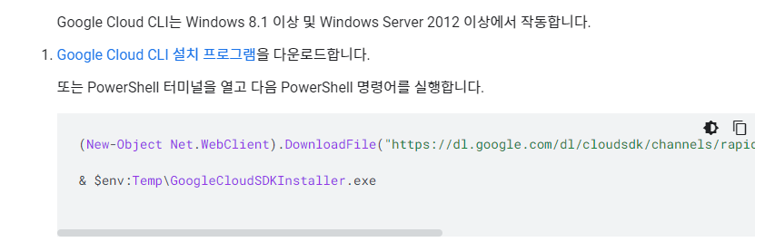 나는 cmd에서 설치하려니 계속 에러가 나서 파란색으로 써있는 GC CLI 설치프로그램 을 클릭해서 다운받았다.