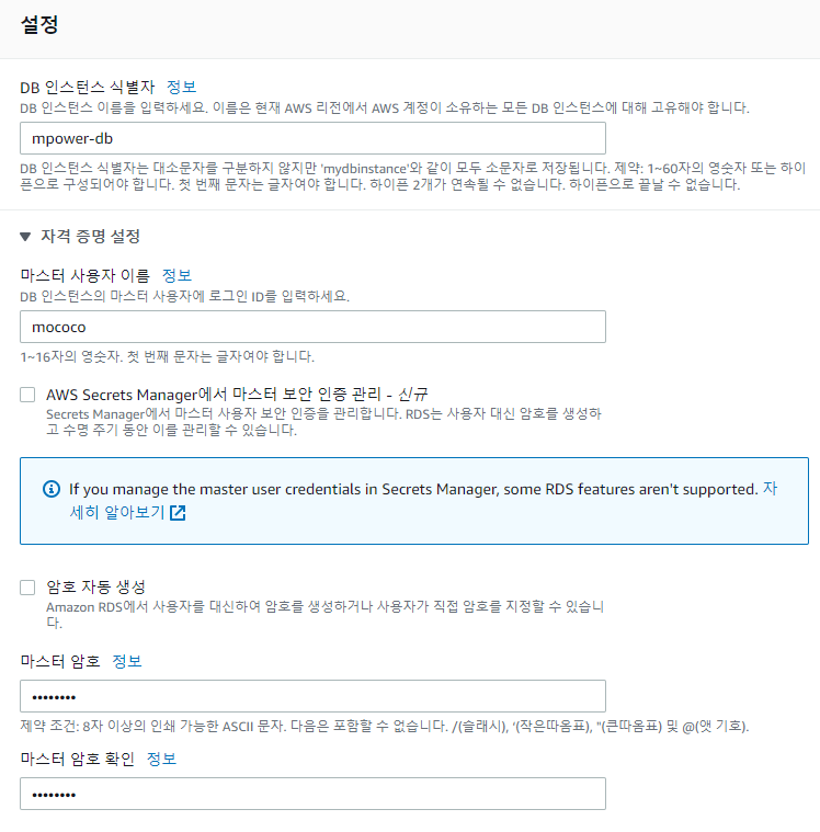 mysql -u mococo -p --host mpower-db.ca6yjfjnwsro.ap-northeast-2.rds.amazonaws.com비밀번호는 마스터사용자 이름 설정할 때 아래에 적어준 비밀번호다.