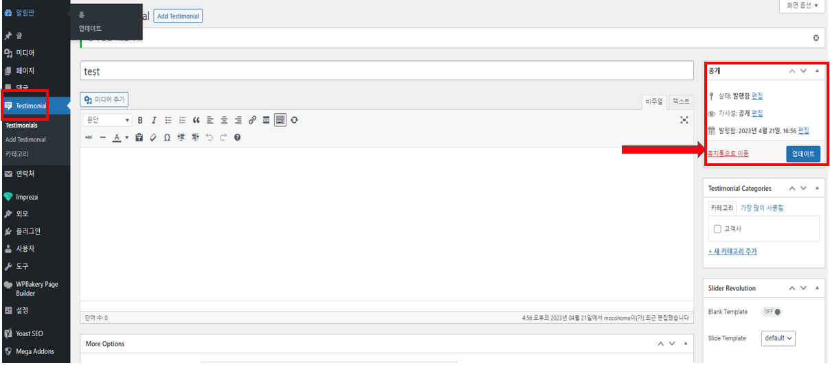 기본으로 '업데이트'(발행)을 누르면 현재시각이 저장된다.