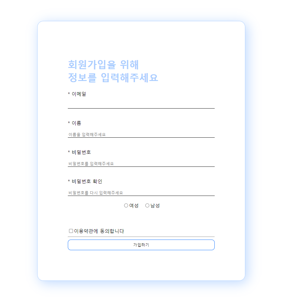 * { box-sizing: border-box; } .wrapper { border: 1px solid #aacdff; border-radius: 20px; box-shadow: 7px 7px 39px rgba(0, 104, 255, 0.25); margin-left: 600px; margin-right: 600px; margin-top: 100px; margin-bottom: 100px; padding: 100px; } h1 { color: #aacdff; } .gender { display: flex; flex-direction: row; align-items: center; justify-content: center; } .gender_btn { width: 70px; text-align: center; } button { box-sizing: border-box; width: 100%; height: 35px; border: 1px solid #0068ff; background: #ffffff; border-radius: 10px; } .mi { width: 100%; border: none; border-bottom: 1px solid black; background-color: transparent; }* input의 박스 형태를 제거하고 싶다면