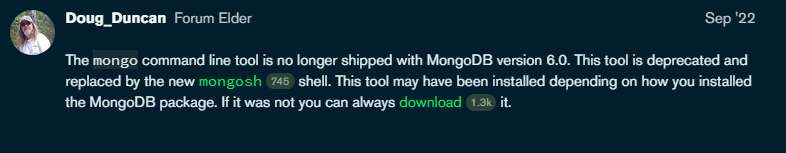 알고보니 내가 설치한 6.0버전부터는 mongo 명령어를 지원하지 않는다고 한다.