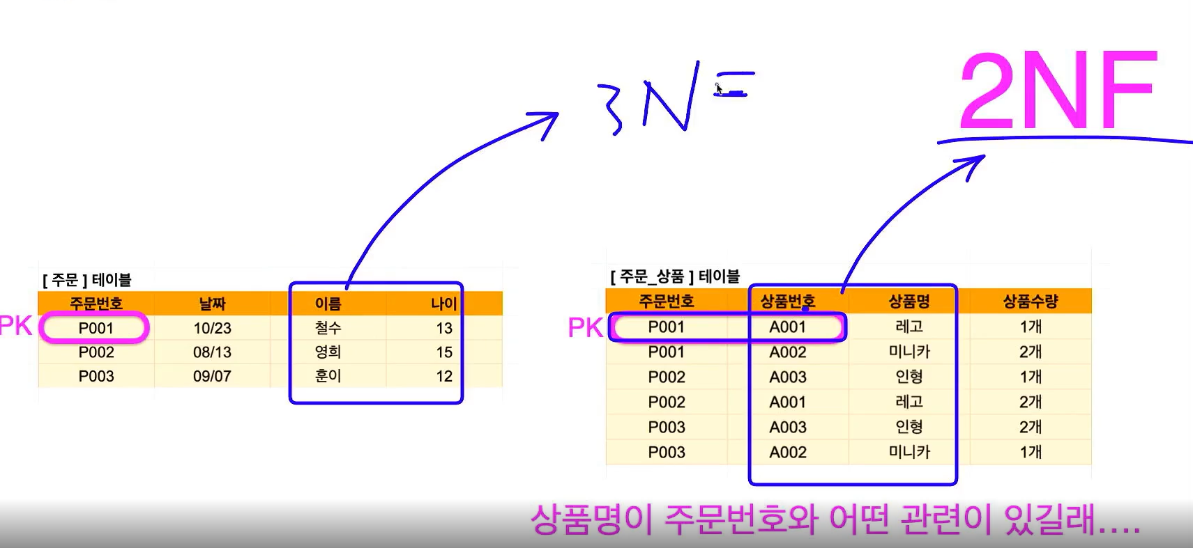 그래서 왼쪽 테이블을 보면 이름과 나이 컬럼을 따로 빼서 하나의 '회원' 테이블을 생성할 수 있다. 이 때 해당 컬럼들은 .PK인 주문번호와 동떨어져있다. 즉, 그렇게 분해되면 3정규형이라는 것.