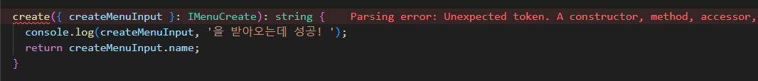 더보기import { Injectable } from '@nestjs/common'; import { Starbucks } from './entities/starbucks.entity'; import { IMenuCreate } from './interfaces/sb.service.interface'; @Injectable() export class SbService { findSb(): Starbucks[] { const result = [ { number: 1, name: '라떼라떼', kcal: 100, fat: 10, protein: 1, sodium: 1, sugars: 1, caffeine: 1, }, { number: 1, name: '녹차프라푸치노', kcal: 490, fat: 10, protein: 10, sodium: 10, sugars: 10, caffeine: 10, }, ]; return result; } create({ createMenuInput }: IMenuCreate): string { console.log(createMenuInput, '을 받아오는데 성공! '); return createMenuInput.name; } }interfaces/sb.service.interface.ts