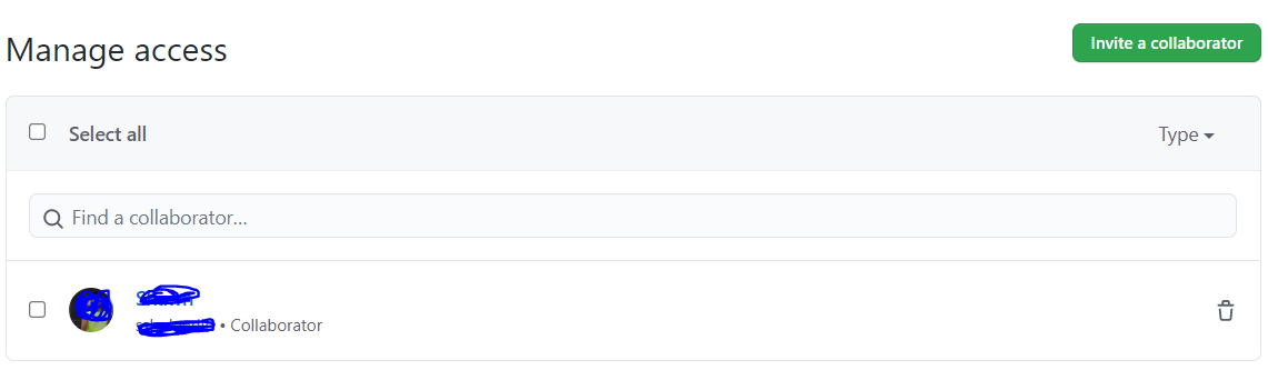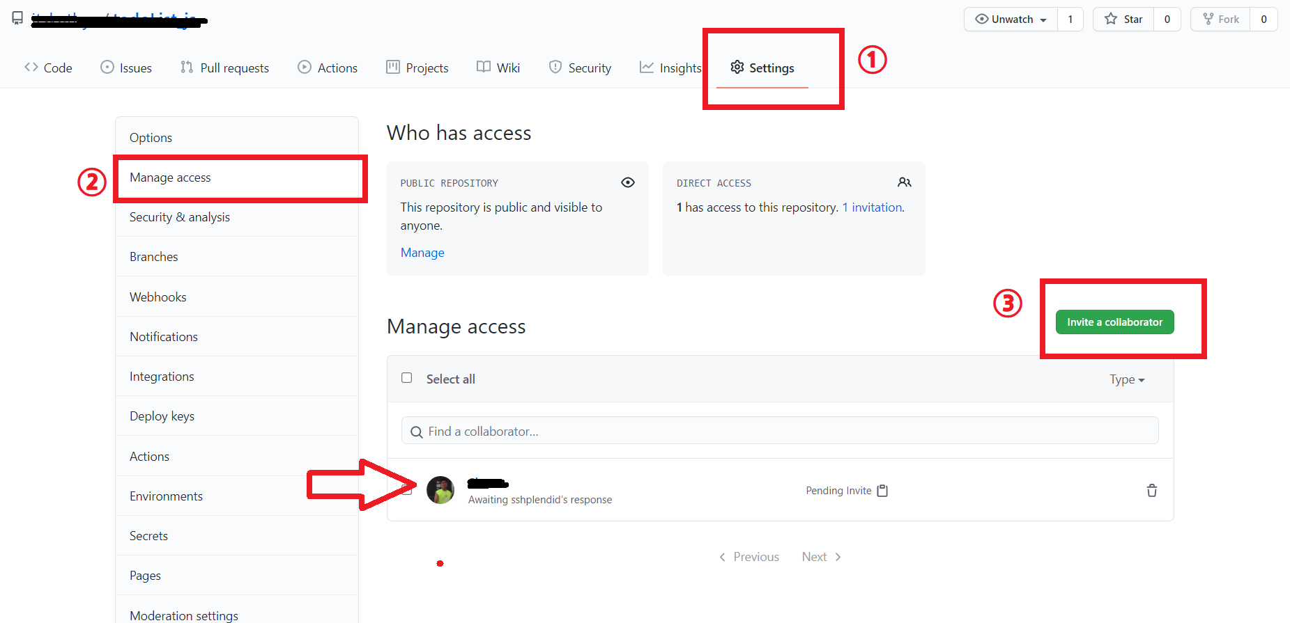 사실 Manage access했을 때 처음 보이는 화면은 이것과 조금 다르다. 3번 invite a collaborator 버튼이 Manage access 섹션 중앙에 있다.