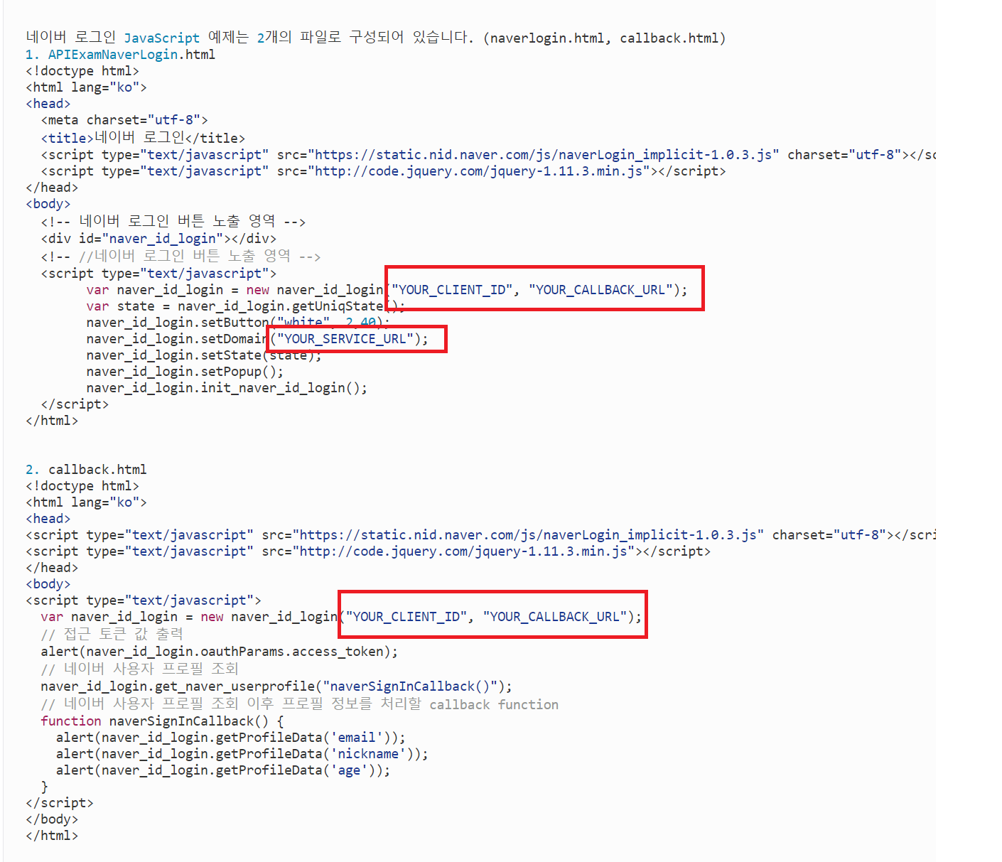 <!doctype html> <html lang="ko"> <head> <script type="text/javascript" src="https://static.nid.naver.com/js/naverLogin_implicit-1.0.3.js" charset="utf-8"></script> <script type="text/javascript" src="http://code.jquery.com/jquery-1.11.3.min.js"></script> </head> <body> <script type="text/javascript"> var naver_id_login = new naver_id_login("pU42VRX2ZAi3vBdfTWmG", "http://localhost:8080/callback.html"); // 접근 토큰 값 출력 alert(naver_id_login.oauthParams.access_token); // 네이버 사용자 프로필 조회 naver_id_login.get_naver_userprofile("naverSignInCallback()"); // 네이버 사용자 프로필 조회 이후 프로필 정보를 처리할 callback function function naverSignInCallback() { console.log(naver_id_login.getProfileData('id')); console.log(naver_id_login.getProfileData('gender')); console.log(naver_id_login.getProfileData('name')); console.log(naver_id_login.getProfileData('age')); console.log(naver_id_login.getProfileData('mobile')); } </script> </body> </html>여기서 변경한 사항은, naverSignInCallback 함수이다.